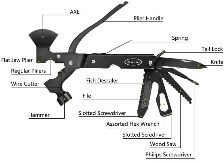 Axe, hammer, knife, saw, screwdrivers, bottle opener, and more — everything a man needs for camp, trail, repairs, or emergencies.